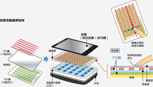 有IPHONE引領(lǐng)的投射電容觸摸屏采用多層ITO層,形成矩陣式分布,以X軸、Y軸交叉分布做為電容矩陣,當(dāng)手指觸碰屏幕時(shí),可通過(guò)X、Y軸的掃描,檢測(cè)到觸碰位置電容的變化,進(jìn)而計(jì)算出手指之所在?;诖朔N架構(gòu),投射電容可以做到多點(diǎn)觸控操作。
