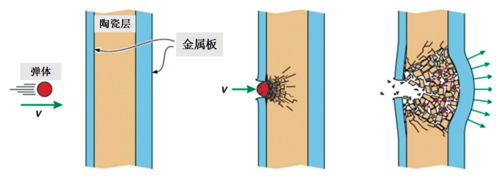 陶瓷層扮演著兩方面的作用:(1)使彈體減速的同時也令彈體變形或碎裂;(2)將彈體的沖擊力分散到一個較大的區(qū)域,使金屬背板能產(chǎn)生利于吸能的大變形,避免其在局部被直接穿透。