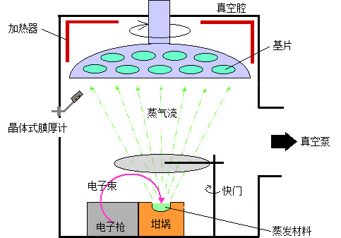 電子束蒸發(fā)的主要原理:高真空環(huán)境下,通過電子槍發(fā)出的高能電子,在電場(chǎng)和磁場(chǎng)作用下,電子轟擊ITO靶材表面使動(dòng)能轉(zhuǎn)化為熱能,靶材升溫,變成熔融狀態(tài)或者直接蒸發(fā)出去,在襯底表面沉積成ITO薄膜。