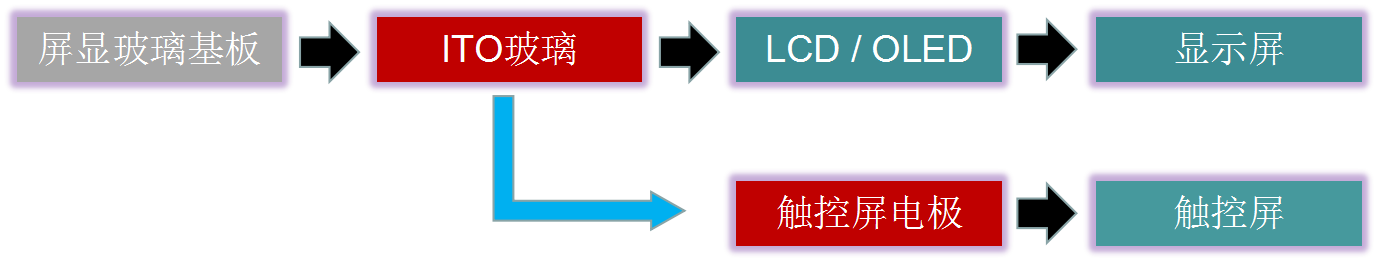 ITO下游產(chǎn)業(yè)主要是平板顯示產(chǎn)業(yè)中的導(dǎo)電玻璃技術(shù),即在鈉鈣基或硅硼基基片玻璃的基礎(chǔ)上,鍍上一層氧化銦錫膜加工制作成的。在平板顯示產(chǎn)業(yè)中應(yīng)用在觸摸屏和液晶面板領(lǐng)域。觸摸屏領(lǐng)域應(yīng)用的是TP-ITO導(dǎo)電玻璃,而液晶面板領(lǐng)域應(yīng)用的是LCD-ITO導(dǎo)電玻璃,兩者的主要區(qū)別在LCD-ITO導(dǎo)電玻璃還會(huì)在鍍ITO層之前,鍍上一層二氧化硅阻擋層,以阻止基片玻璃上的鈉離子向盒內(nèi)液晶里擴(kuò)散。