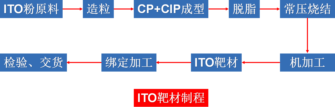其專利 高純高密度ITO靶材的制備方法:將自制的ITO粉加純水配制成漿料,之后加入分散劑,在砂磨機(jī)中砂磨,之后加入粘結(jié)劑和消泡劑進(jìn)行球磨,再經(jīng)噴霧造粒得到ITO造粒粉;將得到的ITO造粒粉裝入模具中預(yù)壓成型得到ITO初坯;將得到的ITO初坯在冷等靜壓機(jī)上成型得到ITO素坯;將得到的ITO素坯在脫脂爐中脫脂,之后再在通氧氣氛的燒結(jié)爐中燒結(jié),即得到高純高密度的ITO靶材。