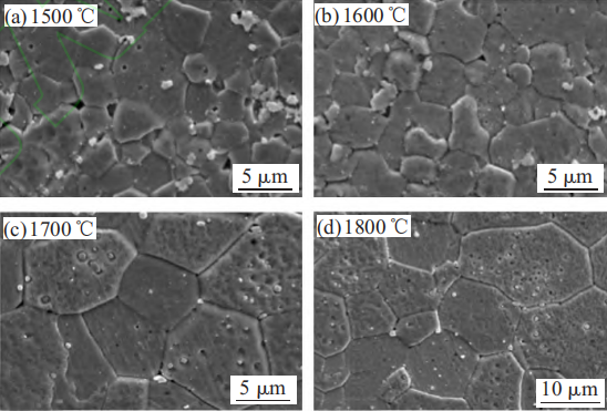 從圖中可以明顯看到,燒結(jié)溫度為1500℃時(shí),平均晶粒大小為3.34um,此時(shí)致密度較低,晶粒之間存在明顯的空隙,燒結(jié)效果并不理想;當(dāng)燒結(jié)溫度為1600℃時(shí),晶粒大小為3.74um,可以看出合金的晶粒大小并沒(méi)有明顯長(zhǎng)大,但是致密性卻有明顯的改善;當(dāng)燒結(jié)溫度為1700℃、1800℃時(shí),晶粒明顯長(zhǎng)大,約9.5um。