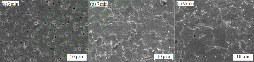 從上圖(a)可以看出,保溫時(shí)間較短時(shí),粉末坯存在明顯的燒結(jié)頸,隨著保溫時(shí)間的增加,燒結(jié)頸消失,孔隙閉合,致密度有明顯增加,并且此時(shí)晶粒尺寸沒(méi)有明顯長(zhǎng)大,如圖(b),之后再進(jìn)行保溫,可以看出晶粒明顯長(zhǎng)大如圖(c)。