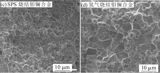 通過(guò)對(duì)SPS燒結(jié)(溫度1600℃、保溫7min)及氫氣保護(hù)燒結(jié)(1800℃,保溫6h)合金進(jìn)行抗拉強(qiáng)度和抗壓強(qiáng)度測(cè)試,發(fā)現(xiàn)采用SPS燒結(jié)的鉬鑭合金抗拉強(qiáng)度以及抗壓強(qiáng)度分別提升765MPa、2307MPa。對(duì)兩種試樣的斷口分析發(fā)現(xiàn)SPS燒結(jié)的合金晶粒大小更加均勻細(xì)小。